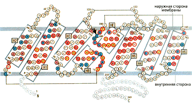 Рис. 5. Схема расположения фрагментов, составляющих мономер аквапорина.