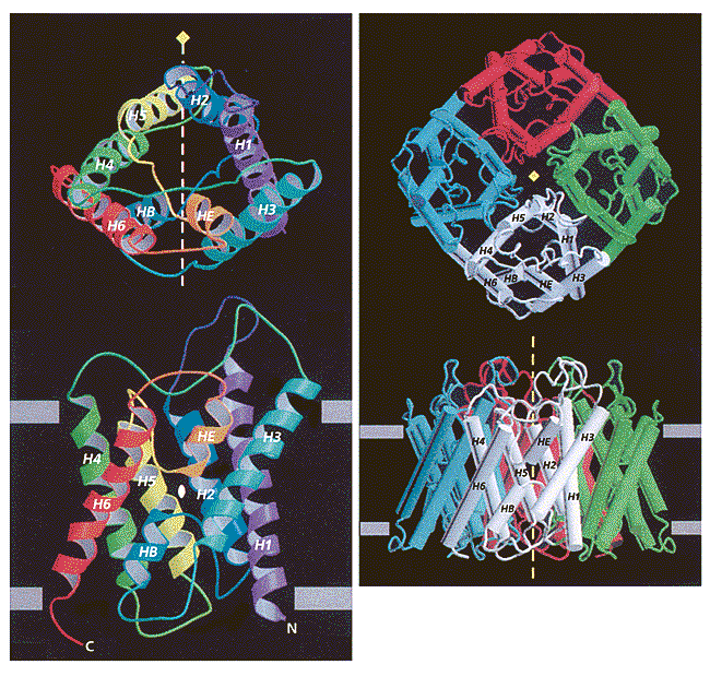 Рис. 6. Стереомодель субъединицы аквапорина и структура тетрамера, показанные с внеклеточной стороны и сбоку (вверху). Спирали в полном белке изображены в виде цилиндров.В полипептидной цепочке каждой функциональной петли содержится фрагмент из следующих друг за другом аспарагина, пролина и аланина (Асн-Про-Ала). Положение петель в поре стабилизировано образованием ионных пар и водородных связей с определенными аминокислотными остатками в структурных спиралях. За счет ван-дер-ваальсовых взаимодействий между пролинами 77 и 193 петли В и Е удерживаются в тесном соседстве. Гидрофобность внутренней поверхности поры и узость щели оказались очень важными для обеспечения исключительно высокой скорости проведения воды. Архитектура канала такова (узкая щель в центре и расширения на противоположных концах), что вода может проникать только в виде тонкой цепочки молекул, соединенных водородными связями. Было известно, что в грамицидиновом канале такая цепочка с большой эффективностью захватывает протоны. Но так как через аквапориновую пору они не просачиваются, это должен обеспечивать специальный механизм,. Долгое время он оставался неизвестным в структурной биологии аквапорина. Считалось, что блокировка требует разрыва водородных связей в водной цепочке и образования новых, но уже с какими-то структурными элементами на поверхности поры. Эгр выяснил, что такой разрыв действительно включен в этот процесс и главная роль в нем принадлежит функциональным спиралям НВ и НЕ.Поскольку дипольные моменты спиралей генерируют положительное электростатическое поле, атомы кислорода в молекуле воды, подошедшей в виде цепочки к центру мембранного пространства, ориентируются к участку Асн-Про-Ала (рис.7). В результате между кислородом и амидной (NH-) группой аспарагина образуется водородная связь, а в цепочке - разрыв. Так возникает препятствие на пути протона.