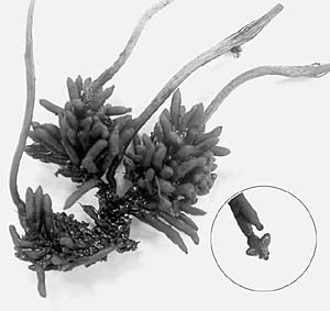 На врезке - корневой отпрыск на кончике корня гнездовки.Более подробное изучение морфологии найденных растений принесло новые сюрпризы. Оказалось, что первые корневые отпрыски могут закладываться уже у некоторых крупных молодых (еще не появившихся над землей) растений. Однако это происходит редко. Зато у пяти из шести цветших в предыдущем году растений найдены не только небольшие утолщения на кончике корня, но и довольно крупные отпрыски с несколькими (иногда десятью и более) собственными придаточными корнями. Иначе говоря, жизнь растения не заканчивается сразу после цветения (как это часто наблюдается у N.nidus-avis), а продолжается по меньшей мере еще год. В это время на многих корнях образуются отпрыски, а лишенные их корни, уже не содержащие крахмала, начинают отмирать.