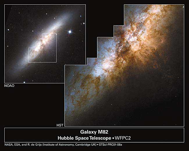 У близкой спиральной галактики M82 множество интересных особенностей: 20-килопарсековый “мостик”, соединяющий ее с соседней галактикой М81; изогнутый звездный диск; наконец, зона вспышечного звездообразования в центральной части и бар (вытянутое звездное утолщение) длиной около 1 кпс, который виден при наблюдениях в ближнем ИК-диапазоне. В оптическом диапазоне облик галактики определяется многочисленными пылевыми волокнами, которые перемежаются с яркими областями звездообразования. С морфологической точки зрения M82 считается маломассивной (1010 M¤) неправильной галактикой, бо́льшая часть массы которой сосредоточена в центральных двух килопарсеках. Имеется много свидетельств, что в недавнем прошлом М82 испытала тесное сближение со своим массивным соседом M81 и карликовой галактикой NGC 3077. Вероятно, именно это стало причиной обильного выпадения газа на центр системы и вспышки звездообразования.