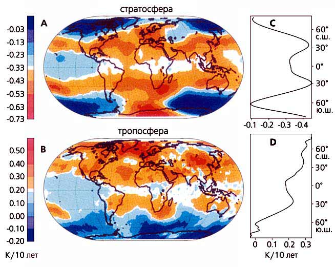 Разогрев тропосферы в средних широтах с 1979 по 2005 г. происходил быстрее, чем в экваториальной и полярных областях. За тот же период стратосфера, напротив, постоянно остывала, причем опять же в средних широтах скорость остывания была больше, чем в экваториальном и полярных широтных поясах. Об этом свидетельствуют результаты спутниковых измерений, проведенных с помощью дистанционного зондирования атмосферы в микроволновом диапазоне.