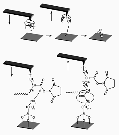 между полимерной цепочкой и аминогруппой покрытия подложки.Результаты исследования свидетельствуют, что существует принципиальная возможность осуществлять химические реакции между всего лишь несколькими молекулами, доставленными иглой АСМ в заданную область поверхности.