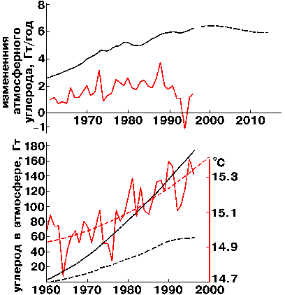 Углерод в земной атмосфере и потепление климата. На верхнем графике цветная ломаная линия показывает ежегодные изменения фактической массы атмосферного углерода в форме диоксида, а черная кривая - его эмиссию вследствие сжигания ископаемых топлив. Ее штриховое продолжение (в следующее столетие) соответствует киотскому протоколу. Разность между черной и цветной зависимостями позволяет вычислить количество углерода, ежегодно поглощаемого фотосинтезом. На нижнем графике даны суммарное поступление углерода в атмосферу начиная с 1960 г. (черная сплошная кривая), суммарный прирост атмосферного углерода (черная штриховая кривая). Цветом изображена зависимость средней температуры земной поверхности (отсчет по правой шкале, ломаная - годичный ход, штриховая - его параболическая интерполяция). Источник данных - ежегодник "Vital Signs", выпускаемый World Watch Institute (США).