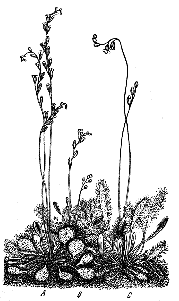 A - Drosera rotundifolia Linneae; B - Drosera intermediata Hayne C - Drosera anglica Huds. |