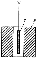 На рис. 4 воспроизведена схема предложенного Эйнштейном эксперимента. Железный стержень S подвешен на тонкой нити внутри питаемого током соленоида коаксиально этому соленоиду. Изменение направления тока вызывает изменение намагниченности стержня и, как следствие, его вращение. Установив на стержне маленькое зеркальце, можно по отклоненному лучу света зафиксировать изучаемое вращение.