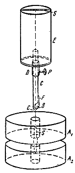 “Достаточно точное подвешивание стерженька по центру (точка подвеса должна находиться на главной оси его инерции - Авт.) сталкивалось с большими трудностями, в преодолении которых мне любезно оказал помощь г-н Егер. В конце концов к цели привел следующий прямо-таки забавный метод. Стерженек зажимается вертикально (не жестко!) на штативе, так, что конец, за который он подвешивается, перевернут вниз. Вертикально под ним, также в перевернутом положении, прикрепляется к штативу соответственно пробка с медной булавкой и кварцевая нить, причем высота тщательно подбирается так, чтобы поднятая (увлажненным пальцем) вверх по прямой линии кварцевая нить уже не касалась плоского торца стерженька (рис. 6). С помощью газовой горелки, сделанной из вытянутой стеклянной трубки, небольшим пламенем нагревается конец S, пока к нему не прилипает подносимый снизу на пальце кусочек канифоли. Канифоль плавится и под действием капиллярных сил образует совершенно симметричную каплю. Если теперь внести в нее снизу кварцевую нить, она смачивается канифолью и втягивается капиллярными силами в глубь капли до предела и, значит, автоматически центрируется. Теперь стоит только охладить стерженек - и подвес готов” [6, с. 384].