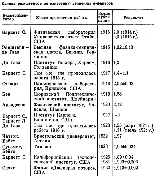 Здесь следует отметить, что Эйнштейн и де Гааз уделяли специальное внимание анализу источников возможных ошибок и методам их устранения. Видимо, когда вычисленное ими из данных опыта значение l приблизилось к ожидавшемуся по формуле (1), они сочли свою работу завершенной *. Зоммерфельд [68] указывает, что повторные опыты де Гааза и других исследователей давали в дальнейшем со все большей достоверностью половинное значение величины l, которую он называет классической. Зоммерфельд при этом ссылается на статью де Гааза, представляющую собой перевод работы [66] на английский язык. В обеих этих работах расхождение между расчетным и измеренным значениями составляло 14%, т.е. последующие исследования де Гааза существено новых экспериментальных результатов не содержали. Эти результаты сведены в таблице, воспроизведеной нами из книги П. Галисона [69, с. 66]. В таблице приведены данные измерений отношения магнитного момента к механическому (Mмагн / Ммех), равного, согласно формулам (1) и (2) этой главы, 1/l = е/(2m). Различие между результатами указанных измерений можно характеризовать коэффициентом g, который, будучи помножен на 1/l дает величину рассматриваемого отношения. Этот множитель g носит название g-фактора. Его теоретическая величина была определена в работе А. Ланде, и мы кратко остановимся на этом несколько позже.