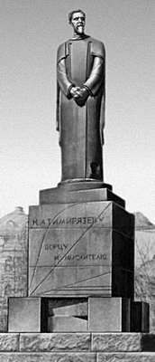 "В своих объяснениях, - говорит далее Тимирязев, - и Дарвин и Маркс исходили из фактического изучения настоящего, но первый, главным образом, для объяснения тёмного прошлого всего органического мира, Маркс же, главным образом, для предсказания будущего, на основании «тенденции» настоящего, и не только предсказания, но и воздействия на него, так как, по его словам «философы занимаются тем, что каждый на свой лад объясняют мир, а дело в том, как его изменить»" (Там же, стр. 340).* * * Перейдём теперь к характеристике тех сторон мировоззрения Тимирязева, которые определили направление его исследований в области физиологии растений. Прежде всего коснёмся отношения науки к практике и роли эксперимента в научном творчестве. Здесь мне хочется допустить одно личное отступление. В Академии Наук СССР мне приходится встречаться со специалистами разных областей науки и с людьми практики. В различных комплексных начинаниях они сотрудничают друг с другом, в общеакадемических изданиях они читают статьи друг друга, на академических заседаниях и совещаниях они лично видят и слушают друг друга, знакомятся между собой, и различные направления теоретической и практической деятельности взаимно оплодотворяют друг друга.И вот, в этой деятельности мне чатсто приходят на ум два образа, которые заставляют ещё энергичнее добиваться таких встреч и такого сотрудничества. Это образы Климента Аркадьевича Тимирязева и Ивана Владимировича Мичурина. Они не встречались друг с другом, и Тимирязев не знал Мичурина. Даже сейчас об этом вспоминаешь с горечью. Они не могли встретиться в силу дореволюционных условий. А такая встреча, знакомство, сотрудничество подняли бы на более высокую ступень русскую сельскохозяйственную науку.