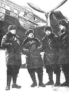 Челюскин самолетах с летчиками М. Я. Линделем и А. Батурой и штурманом