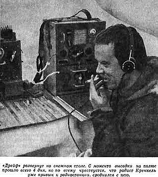 В подготовке экспедиции участвовали многие учреждения и предприятия страны. Работники авиации переоборудовали самолеты для автономных полетов в арктических условиях, научно-исследовательские институты снабдили дрейфующую станцию тщательно подобранной и выверенной аппаратурой и приборами, часть которых изготовили специально для дрейфа, Ленинградская опытная радиолаборатория разработала и изготовила два комплекта рабочей радиостанции "Дрейф" и аварийную радиостанцию "Резерв", Московский институт общественного питания снабдил станцию двухгодичным запасом продовольствия, по специальному заказу была сконструирована каркасная, утепленная гагачьим пухом жилая палатка, пошиты теплая одежда, обувь. Программа работ станции включала обширный комплекс океанографических, метеорологических, геофизических наблюдений и, конечно, службу радиосвязи, без которой все эти наблюдения оставались бы "вещью в себе". Рабочая нагрузка Кренкеля на дрейфующей станции была настолько велика, что просто непонятно, как он с ней справлялся. Четыре раза в сутки передавал он по радио через полярную станцию остров Рудольфа очередные сводки погоды, регулярно через ту же станцию посылал в Арктический институт обширные донесения, содержащие предварительные отчеты о всех научных наблюдениях и исследованиях Федорова и Ширшова, корреспонденцию в центральные и местные газеты - советские люди проявляли огромный интерес к жизни и работе полярников на первой дрейфующей станции. Много радиограмм шло с Большой Земли в адрес самой дрейфующей станции, и на них надо было отвечать. Помимо этой текущей работы, Кренкель занимался наблюдениями за прохождением коротких радиоволн в арктических условиях и еще успевал поддерживать радиосвязь с любителями-коротковолновиками Советского Союза, Европы, Америки, Австралии, Новой Зеландии, причем делалось это во время ночных дежурств Кренкеля - а он дежурил каждую ночь, до шести утра. И наконец, вместе с Папаниным и Федоровым помогал Ширшову в очень трудоемких глубоководных гидрологических наблюдениях, выполнявшихся тогда с помощью ручной лебедки. С наступлением лета и относительно теплой погоды - температура воздуха поднималась лишь немного выше нуля - на льдине началось бурное таяние, повсюду появились ручьи и озерки талой воды. Вода проникала в жилую палатку, заливала продовольственные склады, сама льдина дрейфующей станции оказалась окруженной трещинами и разводьями. Но уже в конце августа заметно похолодало, а в сентябре установилась устойчивая зимняя погода; 5 октября полярники проводили солнце - началась полярная ночь. Дрейф станции проходил значительно быстрее, чем предполагалось: 1 декабря она была уже недалеко от северо-восточной оконечности Гренландии, в тысяче километров от полюса. В конце января 1938 года над станцией, находившейся в южной части Гренландского моря, разразился страшный шторм. Льдина начала разрушаться и вскоре распалась на отдельные куски, разобщенные трещинами и разводьями. Одна из трещин прошла под жилой палаткой, ее пришлось покинуть и переселиться в снежный домик. Радиостанцию закрепили на нартах, чтобы в любой момент ее можно было перетащить на другое место. Работать на телеграфном ключе на открытом воздухе, в мороз и ветер было мучительно тяжело. Но именно теперь бесперебой