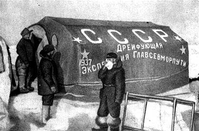 М. Калинин, А. Микоян, А. Андреев, А. Жданов". На четвереньках из палаток вылезали их обитатели, от самолета бежали люди. Шмидт читал ровным громким голосом. Абсолютный штиль, мягко падает снег. Такие минуты незабываемы... А затем начались будни. Тяжелыми пешнями Папанин, Федоров и Ширшов, при помощнике Марке Трояновском, продолбили прорубь. Лед оказался толщиной три метра десять сантиметров. Постепенно прибывают самолеты. Мы посещаем их как гости. Пилоты смотрят на нас косо. Гости стараются что-то прихватить, не гнушаясь ничем.- Инструмент, всякие проволочки, алюминиевые трубы, провода, электрические лампочки - нам понадобится здесь все. Когда нас стали гонять от самолетов, Папанин, который поначалу щедро угощал всех замечательной украинской колбасой, свою щедрость убавил. А так как колбаса была действительно вкусной, то летчики потянулись в гости к нам. Иван Дмитриевич выработал жесткую таксу и начал товарообменные операции: одна колбаса - метр дюралевой трубы. Все довольны, все смеются. Наконец 28 мая установили основную жилую палатку. Управляться с маленькими гайками голыми руками на морозе довольно скучно, но собрали палатку быстро. Собрали, обтянули чехлом, устлали пол шкурами. В палатке тепло и уютно. Затем начали пристраивать к ней снежный тамбур и кухню. В связи с окончанием первой очереди строительства состоялось новоселье. Переехали из легких временных палаток в жилой дом. После маленьких экспедиционных палаток в нем чудо как хорошо. Жилой дом снискал всеобщую зависть участников экспедиции. Еще бы, ведь