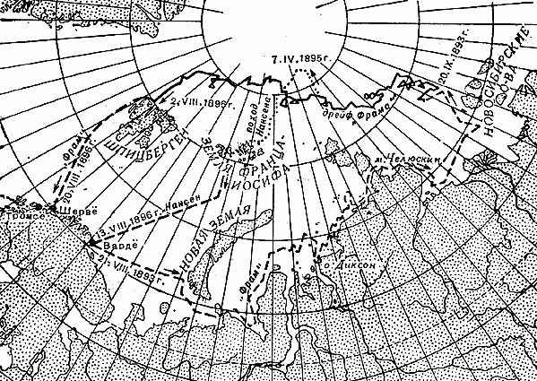 Когда Нансен убедился в том, что судно через полюс или вблизи него не пронесет, ему пришла смелая мысль попытаться достичь полюса по пловучим льдам с помощью собачьих упряжек. В марте 1895 года Нансен в сопровождении Я. Иохансена покинул корабль, который в это время находился на северной широте 84°05' и восточной долготе 101°35'. Достигнув параллели 86°14' и поставив этим рекорд*, путники были вынуждены повернуть обратно.