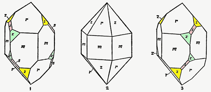 Зато нашлись зарисовки кристаллов левовращающего (1), оптически неактивного (2) и правовращающего (3) кварца.