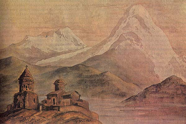 Акварель Э. Геккеля - "Кавказ. Монастырь на Казбеке. 2180 м".