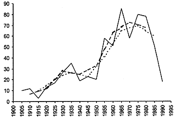 Появление новых метафорических терминов в генетике в XX веке (по пятилетиям - сплошная линия). Этот же график после сглаживания методом "скользящей средней", начиная с трех первых точек (штриховая линия); то же в "противофазе", со сдвигом на одну точку вправо (пунктирная линия).В периоды перед обеими мировыми войнами, во время и после них на кривой видны прогибы (первый почти нивелируется при спрямлении). Вероятно, генетикам тогда было "не до метафор".Кстати, следует особо отметить, что подобные прогибы, охватывающие периоды этих войн, видны и на хронологических наукометрических графиках других дисциплин, построенных ранее другими авторами - на основании анализа количества докторов наук в США, публикаций в физическом реферативном журнале, числа астрофизических, математических и радиационно-химических исследований, а также научных публикаций в целом (см. [18, С.224-245]), - но ими не обсуждавшихся. Возможно, эти прогибы свидетельствуют, что спад различных количественных показателей творчества ученых может служить индикатором и предвестником социальных бедствий и, в частности, больших войн.