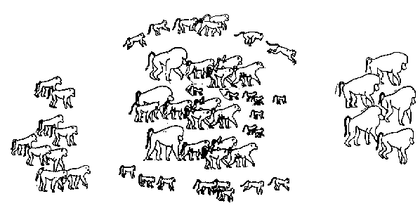 Стадо павианов проходит опасный участок саванны. Иерархи идут в центре стада Около доминантов идет самая ценная для них часть стада: молодые самки, самки, несущие детенышей младшего возраста, и несамостоятельные детеныши. С одной стороны, это позволяет за ними следить, а с другой - это безопасное место. Самостоятельная молодежь располагается по периферии ядра стада. Впереди стада, на расстоянии видимости, развернутой цепью идет авангард из самцов второго ранга (субдоминантов). Они занимают это положение по понятным мотивам: отношения с иерархами у них напряженные, они предпочитают держаться подальше от доминантов и не видеть их. Те же, напротив, предпочитают не терять субдоминантов из поля зрения, ибо все время подозревают их в двух грехах: прелюбодеянии с самками и покушении на власть. Авангард - наиболее опасное место. Столкнувшись с умеренно сильным хищником, авангард развертывается полумесяцем и стремится задержать его, а стадо в это время убегает. Хищники предпочитают не связываться с самцами, которые довольно сильны даже поодиночке, а тем более, когда действуют сообща.