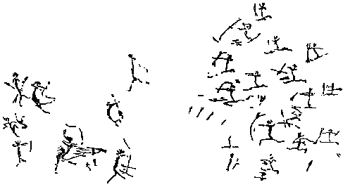 Возможно это самое древнее изображение войны (Восточная Испания, разумный человек, эпоха охот и людоедства; не ранее 9-7 тыс. лет назад). Правое "войско", используя численное превосходство, стремительно атакует "павианьим выпуклым полумесяцем", стреляя на бегу из луков. Противники стреляют с места. Их строй тоже "павианий", но оборонительный: авангард из четырех человек образует вогнутый полумесяц и каре, прикрывающее двух раненых в центре. В отличие от сцен сражений в более позднюю апоху, никто не убегает. Чему служила мстительность. Реакция стада на похищение из его рядов одного из членов хищником у разных видов своя. Многие травоядные млекопитающие и многие виды птиц относятся к этому как к чему-то неизбежному и незначительному: отбежали, тут же успокоились и продолжают прежнюю жизнь. В момент нападенм на стадо хищник тоже может быть атакован, но, схватив жертву, он больше ничем не рискует. Другие виды делают короткую попытку отбить собрата. Но стоит хищнику немного отбежать или отлететь, каК стадо прекращает его преследовать. А есть виды с удивительным поведением: они могут часами гнаться за хищником и донимать его. Всем знакомый пример - вороны. Если кто-то схватил ворону и поволок прочь, ее товарки скликают всех окрестных ворон, и те начинают с воплем преследовать хищника, не позволяя ему насытиться добычей. И зачастую им это удается: хищник в конце концов бросает труп вороны и спешит скрыться. Но этим неприятности для него не кончаются. Теперь, где бы он ни появился, вокруг слетаются вороны и поднимают гвалт. Жить в такой обстановке хищнику неуютно, а охотиться просто бесполезно. Такое поведение ворон очень эффективно. Хищник быстро усваивает, что ворону, может быть, и легко поймать, но съесть ее не так просто. А если и поймаешь, то потом наголодаешься: охотиться не дадут. С воронами лучше не связываться.