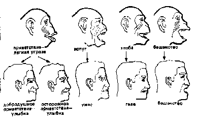 Оскалы и улыбки. У человека они менее выразительны, чем у шимпанзе, из-за ослабления мышц лица. Оскалы и улыбки. Иерархические стычки между людьми происходят много чаще, чем мы думаем. Дело в том, что естественный отбор создал много программ, смягчающих столкновения. Вот один довольно забавный пример. Демонстрация оскала - широчайше распространенная у позвоночных инстинктивная программа. Ее цель - предупредить при встрече с кем-либо о вооруженности и готовности за себя постоять. Приматы пользуются ею очень широко при контактах. Человек тоже скалит зубы при сильном страхе или гневе. Оказаться адресатом такой демонстрации неприятно.