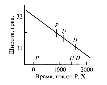 Рис. 2. Изменение со временем широты Арктура из-за большого собственного движения [9]. Буквами Р, U, Н на оси абсцисс отмечены эпохи создания звездных каталогов Птолемея из "Альмагеста", Улугбека и Гевелия; на прямой, отражающей движения Арктура, положения этих же букв соответствуют эпохам, которые получились бы для этих каталогов, если определять их по приведенным в каталогах широтам Арктура; в этом случае каталог Птолемея датируется Х в.Датировка каталога "Альмагеста" по собственным движениям звезд предложена впервые Ю.А. Завенягиным почти 20 лет назад; впоследствии этот метод был развит Ю.Н. Ефремовым и Е.Д. Павловской [10]. Он основан на исследовании изменения взаимных расстояний звезд в конфигурациях, включающих звезды с большим собственным движением. Фоменко с соавторами пытались его критиковать [3], но верность оспариваемого ими отождествления самой "быстрой" звезды каталога с Омикрон-2 Эридана была доказана [9]. Этот метод, как мы отмечали [10], чувствителен к выборке используемых звезд и точность определения с его помощью эпохи звездного каталога "Альмагеста" не позволяет судить, кто проводил наблюдения - Гиппарх или Птолемей, но о том, что они выполнены в Х в., не может быть и речи [10].