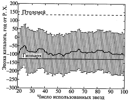 Рис. 3. Зависимость получаемой по собственным движениям эпохи каталога "Альмагеста" - кривая, проведенная через середины интервалов средних квадратичных ошибок - от числа используемых "быстрых" звезд (в порядке убывания величины их собственного движения) [15]. Указаны эпохи Гиппарха и Птолемея; для получения устойчивого результата достаточно 30-40 звезд