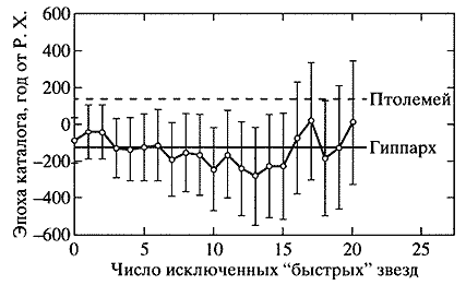 Устойчивость решения демонстрируют рис. 3 и рис. 4. Как следует из рис. 3, примерно 40 звезд с наибольшими собственными движениями, дают устойчивое решение: включение других звезд с меньшими собственными движениями не изменяет результата. Если же исключить три звезды с наибольшими движениями, в том числе Арктур, то эпоха каталога составит (-134 ± 158) г., что весьма близко ко времени, когда Гиппарх определял склонения 18 звезд (напомним, она получается с большой точностью по прецессии). Дальнейшее исключение звезд (в порядке убывания их собственных движений) не уводит от этой эпохи, то есть она не зависит от немногих "быстрых" звезд (см. рис. 4). Можно даже заподозрить, что координаты Арктура и Альфа Кентавра - третьей и второй звезды по величине собственного движения - имеют в каталоге "Альмагеста" заметные ошибки. Для Альфа Кентавра это неудивительно: звезда южная и была видна лишь очень низко над горизонтом. Если же исключить весь первый десяток самых "быстрых" звезд, эпоха получается -246 г., но ошибка уже составит 225 лет. Фоменко - математик и легко может определить, с какой вероятностью отвергается Х в. как эпоха создания каталога при вышеприведенных значениях.