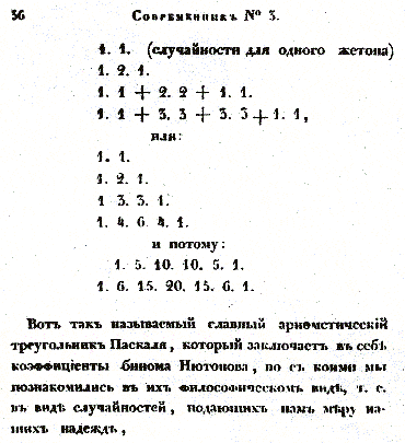 Статья представляла собой популярное изложение теории вероятностей, на русском языке едва ли не первое, как я узнал впоследствии. Чтение ее доставляло истинное удовольствие, она была оживлена примерами, взятыми из истории. На ее страницах не раз встречались имена Наполеона, Лапласа, приводились (в переводах Козловского) стихи Вальтера Скотта. Любопытно, что одним из стимулов для ее написания, как видно из текста, являлось стремление автора доказать призрачный характер надежд, столь часто приводящих к трагедиям за карточным столом.