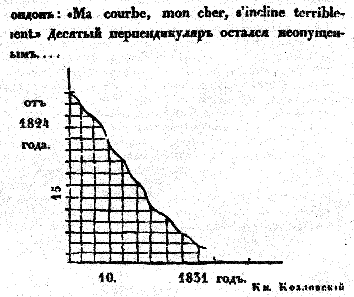 "Предложение сие, - писал Козловский, - нашло меланхолический отголосок в сердце Дальберга; он опускал регулярно перпендикуляры и соединял их черточками, показывающими наклонение. В 1831 году, после холеры, писал он ко мне из Парижа в Лондон: Ма courbe, mon cher, s'incline terriblement (Моя кривая, дорогой мой, устрашающе падает - фр.). Десятый перпендикуляр остался неопущенным..."Воспроизведением "кривой Дальберга" вслед за этими заключительными словами и заканчивалась статья Козловского.