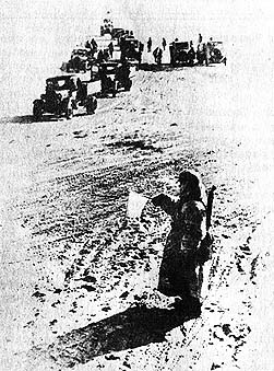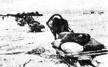 Ледовая трасса через Ладожское озеро. 1941 год. Переправу войск по ледяным плацдармам ночью, не видя берегов, или днем, в туман и пургу, можно сравнить с лоцманской проводкой судов в кромешной тьме, когда не работают маяки и вообще отсутствуют навигационные средства. Аналогия станет более полной, если учесть, что ветер сносил колонны на льду, как и корабли, в сторону от проложенного курса следования. Не раз приходилось видеть, как дрейфуют на скользком, словно отполированном, льду боевые порядки пехоты, как сумасшедший ветер, вырвав из строя отдельных бойцов, гнал эти "живые паруса" на минные поля, как волчком крутились и опрокидывались автомашины. Далеко не каждый переход кончался благополучно.