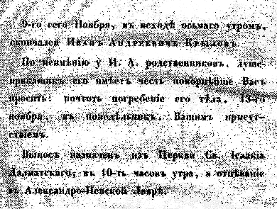"9-го сего Ноября, в исходе осьмого утром, скончался Иван Андреевич Крылов. По неимению у И.А. родственников, душеприказчик его имеет честь покорнейше Вас просить: почтить погребение его тела, 13-го ноября, в Понедельник, Вашим присутствием. Вынос назначен из Церкви Св. Исаакиа Далматского, в 10-ть часов утра, а отпевание в Александро-Невской Лавре".