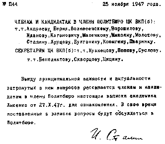 того же года, сопровождающую рассылку письма Лысенко членам и кандидатам