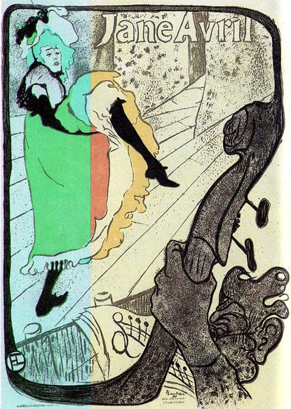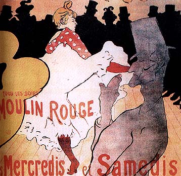 Известным широкой публике Тулуз-Лотрек стал именно благодаря рекламным листам на афишных тумбах, появившихся в те годы на парижских тротуарах. Первый же из них - плакат открывшегося в 1889 г. "Мулен Руж" со скандально известной танцовщицей Ла Гулю ("Ненасытная") - произвел фурор. Прохожие толпились около мест расклейки, пытаясь расшифровать подпись художника. Плакаты срывали, чтобы отнести к себе домой. Скажем попутно, что судьба самой "Ла Гулю" - Луизы Вебер - сложилась трагически. Получая фантастические средства от великосветских щеголей во время выступлений в кабаре, она, постарев, быстро их растратила, пыталась работать в цирке, потом стала прислугой в публичном доме и, наконец, побирушкой на парижских улицах. От прошлого у нее до смерти сохранилась только белая юбка из Мулен Руж, в которой ее изобразил когда-то Тулуз-Лотрек. Из нее она сделала занавеску на окно своей лачужки, где и умерла.