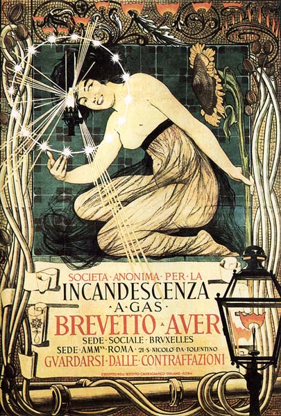 Реклама компании газовых ламп. 1895 г.В жанре рекламы работал и уже упоминавшийся шотландский график Чарльз Ренни Макинтош, создававший композиции в духе так называемого "линейного дизайна" (жесткого модерна). Совершенно иной стиль, близкий к Тулуз-Лотреку, но, тем не менее, оригинальный, отличает плакаты известного французского художника Пьера Боннара. Самый знаменитый его плакат - "Французское шампанское" (1891). Боннар использовал модные изгибы "арт нуво", чтобы создать игривый образ женщины с бокалом веселого напитка в руке.