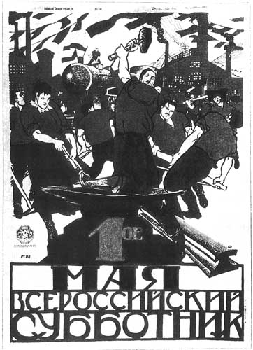 Стиль модерн был популярен среди интеллигенции, состоятельных и не очень состоятельных горожан. Поэтому несколько удивительно, что "по инерции" стиль перешел и в другую историческую эпоху - революционную. Передаточным звеном были, несомненно, художники, работавшие по заказам советских организаций. Так в 1918 г. на кремлевской стене торжественно была открыта стела С. Коненкова "Павшим в Борьбе": гений Победы одной рукой поднимает красное знамя, другой протягивает пальмовую ветвь мира. По цели своей стела - произведение пропагандистского искусства, а решена явно в духе стилистических особенностей модерна-символическая насыщенность образов, цветовая гамма, причудливый абрис фигур. Модерн использовался и в политических плакатах периода гражданской войны, хотя, казалось бы, лежавшая в основе стиля философская концепция бесконечно далеко отстояла от остро напряженного противоборства двух цветов - красного и белого.