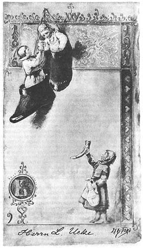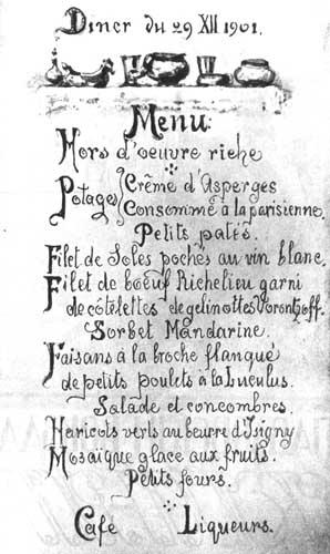 Имелись и, так сказать, промежуточные случаи, когда изобразительная часть была решена в рамках "традиционализма" и на хорошем уровне, но вот выбор сюжета очень напоминал известную поговорку о корове и седле. Так, на меню ресторана (автор - известная в жанре малой графики художница начала века Елизавета Бем) без затей, но вполне в рамках стиля, изображены то ли калоши, то ли опорки и "древнерусские" дети, хотя связь одного с другим непонятна, да и объект презентации не имеет никакого отношения ни к детям, ни к калошам, ни к Руси, поскольку все блюда на обороте перечислены по-французски, как практиковалось в то время. Впрочем, композиция выглядит очень мило. Забавно смотрится и перечень блюд из меню работы В. Васнецова (суп по-американски и жаркое "Французские цыплята") в оформлении из Георгия-Победоносца.