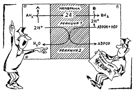 Нам нужно, чтобы дыхание влияло на фосфорилирование, и эта цель достигнута: влияние уже есть. Беда в том, что оно направлено не в ту сторону, куда хотелось бы: дыхание затрудняет реакцию фосфорилирования вместо того, чтобы облегчать ее. Но ведь мы не учли еще один непременный компонент системы - мембрану. Плохо, если вода, образующаяся при дыхании, и вода, образующаяся при синтезе АТФ, выделяются по одну и ту же сторону от мембраны, то есть в один и тот же отсек. Это равносильно протеканию двух реакций в одной пробирке. А что, если два процесса образуют воду по разные стороны от мембраны?