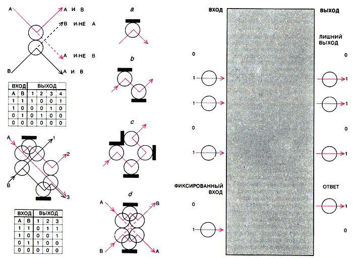 Бильярдная модель компьютера: движение бильярдных шаров по поверхности стола моделирует прохождение битов информации через логический вентиль. В бильярдных логических вентилях (слева) траектории шаров изменяются при их столкновениях друг с другом или с "зеркалами". Кроме функций, выполняемых ими в вентилях, зеркала могут менять угол траектории шара (а), сдвигать ее в сторону (b), задерживать шар, не меняя его конечного направления или скорости (с), или заставлять траектории пересекаться (d). Зеркала можно расставить таким образом, чтобы получившийся в результате "компьютер" выполнял функции любого логического устройства. Например, можно построить бильярдный компьютер для распознавания простых чисел. Такой компьютер (справа) на входе принимает произвольное пятизначное двоичное число (в данном случае 01101, или 13) и фиксированную входную последовательность 01. Как и вентиль Фредкина, бильярдный компьютер возвращает больше битов на выходе, чем нужно пользователю. В рассматриваемом случае он возвращает само исходное число (представляющее собой "лишний" выход) и "ответ": последовательность 10, если число на входе простое, и 01, если оно составное.Чтобы начать процесс вычисления, мы выстреливаем бильярдным шаром по входу компьютера, если нужно ввести единицу. Шары должны входить в машину одновременно. Поскольку шары абсолютно упругие, они не теряют энергии при столкновении друг с другом. Они выйдут из машины, обладая тем же количеством кинетической энергии, с которым вошли в нее.В процессе работы бильярдный компьютер порождает "мусорные биты", как и компьютер, построенный на вентилях Фредкина. После того как компьютер завершил выполнение задачи, мы отражаем бильярдные шары в обратном направлении, обращая процесс вычисления вспять. Шары выйдут из машины в точности там же, откуда мы их направили в машину, и при этом будут двигаться с той же скоростью. Таким образом, механизм, запустивший шары в машину, может получить теперь обратно их кинетическую энергию. И в этом случае, выполнив вычисление, мы можем вернуть компьютер в исходное состояние, не рассеивая энергии.