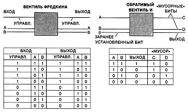 Хотя до сих пор наши рассуждения основывались главным образом на классической динамике, несколько исследователей предложили другие модели обратимых вычислительных машин, основанных на принципах квантовой механики. Такие машины, впервые предложенные П. Бениоффом из Национальной лаборатории в Аргонне (Франция) и усовершенствованные другими, в особенности Р. Фейнманом из Калифорнийского технологического института, до сих пор были описаны лишь в самых общих выражениях. По существу, частицы в этих моделях компьютеров должны быть расположены таким образом, чтобы правила квантовой механики, управляющие их взаимодействием, были в точности аналогичны правилам, предсказывающим значения сигналов на выходах обратимых логических вентилей. Предположим, например, что спин частицы может иметь только два возможных значения: направление вверх (соответствующее двоичной 1) и вниз (соответствующее 0). Взаимодействие между значениями спинов частиц должно проходить таким образом, чтобы значение спина данной частицы изменялось в зависимости от спина частиц, находящихся поблизости. При этом спин частицы будет соответствовать одному из выходов логического вентиля.