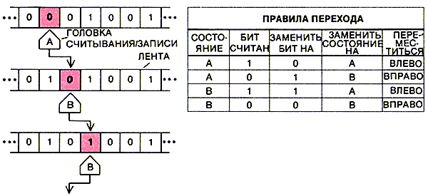 Машина Тьюринга способна выполнить любое вычисление, которое может выполнить ЭВМ. Бесконечно длинная лента поделена на дискретные сегменты, в каждом из которых записан 0 или 1. "Головка для считывания и записи", которая может находиться в любом из нескольких внутренних состояний (здесь только два состояния: А и В), перемещается вдоль ленты. Каждый цикл начинается с того, что головка считывает один бит с сегмента ленты. Затем, в соответствии с фиксированным набором правил перехода, она записывает в сегмент ленты бит данных, изменяет свое внутреннее состояние и перемещается на одну позицию влево или вправо. Поскольку данная машина Тьюринга обладает всего двумя внутренними состояниями, ее возможности ограничиваются лишь тривиальными вычислениями. Более сложные машины с большим числом состояний способны смоделировать поведение любой ЭВМ, в том числе и значительно более сложной, чем они сами. Это оказывается возможным благодаря тому, что они хранят полное представление логического состояния большей машины на бесконечной ленте и разбивают каждый вычислительный цикл на большое количество простых шагов. Показанная здесь машина логически обратима: мы всегда можем определить предшествующие состояния машины. Машины Тьюринга, обладающие другими правилами перехода, могут и не быть логически обратимыми.Машина Тьюринга состоит из нескольких компонентов. Один из них - лента, поделенная на отдельные участки или сегменты, в каждом из которых записаны 0 или 1, представляющие собой входные данные. "Головка для считывания и записи" движется вдоль ленты. Головка может выполнять несколько функций - считать с ленты один бит данных, записать один бит на ленту и переместиться на один сегмент влево или вправо. Чтобы на следующем цикле сохранять информацию о том, что делалось на предыдущем, у механизма головки имеется ряд так называемых "состояний". Каждое состояние представляет собой свою, несколько отличную от других конфигурацию внутренних частей головки.На каждом цикле головка считывает бит с того сегмента ленты, напротив которого она в данный момент находится. Затем она записывает новое значение бита на ленту, изменяет свое внутреннее состояние и перемещается на один сегмент влево или вправо. Значение бита, который она записывает, состояние, к которому она переходит, и направление, в котором она перемещается, определяются фиксированным набором правил перехода. Каждое правило описывает определенные действия. Какому правилу следует машина в данный момент, определяется состоянием головки и значением бита, только что прочитанного с ленты. Например, правило может быть следующим: "Если головка находится в состоянии А и расположена напротив сегмента, в котором записан 0, то она должна изменить значение этого бита на 1, перейти к состоянию В и переместиться на один сегмент вправо". Согласно какому-нибудь другому правилу, машина не должна менять своего состояния или не записывать нового бита на ленту, или же должна остановиться. Не все машины Тьюринга обратимы, но можно построить такую обратимую машину Тьюринга, которая способна выполнить любое вычисление.
