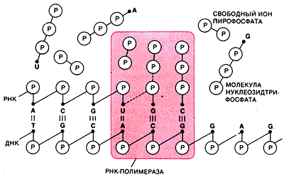Описанные реакции обратимы: иногда фермент присоединяет к последнему основанию растущей цепи РНК свободный ион пирофосфата и в окружающую среду высвобождается молекула рибонуклеозидтрифосфата, а сам фермент возвращается на одну позицию назад вдоль цепи ДНК. В состоянии равновесия шаги в прямом и обратном направлениях происходят с одинаковой частотой, но в живой клетке другие процессы метаболизма сдвигают равновесие в сторону прямой реакции за счет удаления пирофосфата и создания избытка рибону-клеозидтрифосфатов. В лабораторных условиях можно регулировать скорость РНК-полимеразной реакции, варьируя концентрации исходных реагентов (это доказали Дж. Левин и М. Чемберлен из Калифорнийского университета в Беркли). По мере того как концентрации приближаются к равновесным, фермент работает все медленнее, и при копировании данного участка ДНК рассеивается все меньше энергии, поскольку отношение числа шагов в прямом и обратном направлениях становится меньше.