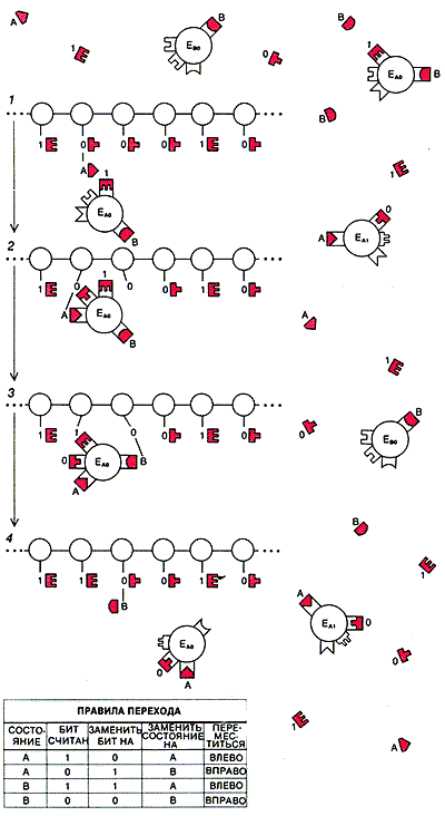 Чтобы осуществить требуемый переход, молекула фермента сначала приближается к позиции на ленте, находящейся непосредственно справа от основания, к которому в данный момент прикреплена головка типа А. Затем она отделяет от ленты и молекулу-головку, и основание 0, к которому головка прикреплена, и помещает на их место основание 1. Затем она прикрепляет головку типа В к основанию, находящемуся справа от единичного основания, только что прикрепленного к ленте. На этом переход завершается. На исходном сегменте ленты 0 был заменен на 1, молекула-головка относится теперь к типу В и прикреплена к основанию, находящемуся на одну позицию правее исходной.