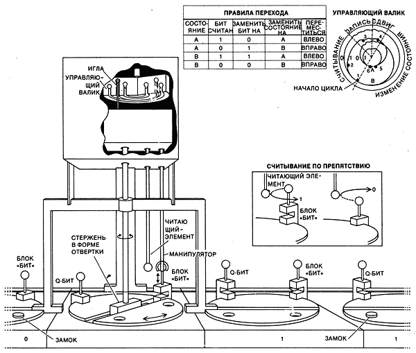 Если инструкция требует изменить значение бита, манипулятор приводится в действие и зацепляет за выступ блока, затем отвертка поворачивает диск, пока блок не освободится, манипулятор поворачивает блок вверх или вниз, а отвертка опять поворачивает диск, так что блок занимает свое место. Пройдя сегмент "записи" управляющего валика, игла входит в сегмент "сдвига" (4). Каждая канавка этого сегмента содержит инструкцию перемещения головки на одну позицию влево или вправо. Далее игла входит в сегмент "изменения состояния" (5), где канавки сливаются таким образом, что игла попадает в канавку, представляющую следующее состояние головки. Теперь цикл завершен (6). Диски соседние со считываемым в данный момент, удерживаются в нужном положении головкой. Диски, отстоящие дальше, заперты на специальный "замок". Замок каждого диска связан со специальным битом, называемым Q-битом, соседнего диска. Устройство этой связи таково, что диск читаемый в данный момент, освобожден и его можно двигать, в то время как диски, удаленные от него как слева так и справа, поддерживаются в неподвижном состоянии.