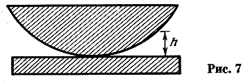 Количественные исследования в этой области трудны, так как толщина споев - порядка 1/1000 мм. Нужно измерять такие малые толщины. Соответственных устройств для этого тогда не-было. Ньютон обходит трудность этого измерения замечательным приемом. На плоскую стеклянную поверхность он кладет выпуклой стороной плоско-выпуклую линзу - объектив телескопа с очень большим радиусом кривизны (рис. 7). Тогда между нижней плоской и верхней выпуклой поверхностями образуется чрезвычайно тонкий слой воздуха, обнаруживающий пестрые яркие цвета; цветные кольца в белом свете и чередование одноцветных светлых и темных колец - в однородном.