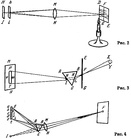 Таковы, например, установка на минимальный угол отклонения призмы (рис. 4); простой, но чрезвычайно эффективный метод скрещенных призм и т. д. Для получения чистого спектра возможно большей интенсивности Ньютон пользовался устройством (коллиматорная щель, призма и фокусирующая аппаратура), которое лежит и сейчас в основе всех призменных и других спектроскопических приборов.