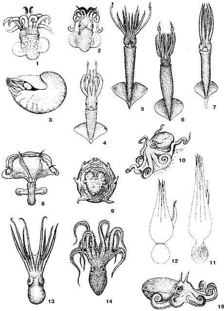 Но может быть, глубоководные осьминоги не сидят на яйцах так неотлучно, как мелководные, а ползают вокруг и кормятся? Ничего подобного! И мне, и моим коллегам не раз попадались в тралах самки бугорчатого батиполипуса с яйцами, аккуратно приклеенными к отмершим глубоководным стеклянным губкам (очень надежная защита: стеклянная губка так же “съедобна”, как стеклянный стакан). Представьте себе ужас маленького, с ладонь, осьминога, когда на него со скрежетом, в окружении перепуганных рыб, надвигается невероятных размеров чудовище — промысловый донный трал. Но ведь не бросает самка яиц! И самки арктического батиполипуса в канадском аквариуме честно сидели на яйцах в постоянной о них заботе целый год до вылупления молоди. Правда, ни я, ни мои коллеги ни разу не видели в траловых уловах самок бентоктопусов и гранэледоне с яйцами. Зато нам неоднократно попадались крупные самки этих осьминогов с дряблым, похожим на тряпку, телом и абсолютно пустым яичником. Скорее всего то были насиживающие (выбойные, т.е. выметавшие яйца) самки, спугнутые с яиц приближающимся тралом. Но вот выметанных ими яиц мы не видали ни разу. Наверное, они их хорошо прячут. Считается, что кроме осьминогов никакие другие головоногие моллюски отложенные яйца не охраняют (даже не закапывают в землю, подобно крокодилам и черепахам). Сколько же развиваются их яйца? До сих пор мы говорили о бесплавниковых, или обыкновенных, осьминогах, но есть и плавниковые. Это глубоководные, очень странные на вид осьминоги — студенистые, как медуза, и с парой больших, похожих на спаниелевые уши, плавников по бокам тела. Цирротейтис (Cirroteuthis muelleri) живет в глубинах Норвежского, Гренландского морей и всего Центрального Полярного бассейна, вплоть до полюса — на дне, над дном и в толще воды. В покое он похож на раскрытый зонтик (если смотреть сверху), а при бегстве от опасности, со сложенными руками, — на цветок колокольчика (если смотреть сбоку). Два вида опистотейтисов (Opisthoteuthis) — обитатели Берингова, Охотского морей и северной части Тихого океана. Эти осьминоги в покое, лежа на дне, похожи на толстый пышный блин с “ушками” на макушке, а при плавании и парении над дном — на широкую чайную чашку. Яйца у них у всех крупные, длиной 9—11 мм. Самка откладывает их по одному прямо на дно и больше о них не заботится, да и нужды нет: они защищены плотной хитиновой оболочкой, подобной скорлупе, и настолько прочной, что выдерживает даже пребывание в желудках глубоководных рыб. Длительность развития этих яиц, по расчету, не меньше, чем у обыкновенных осьминогов, охраняющих кладку: 20—23 месяца на дне Берингова и Охотского морей, 31—32 месяца в глубинах Полярного бассейна! Самые крупные яйца из всех головоногих — у наутилуса (Nautilus pompilius). Того самого, чье имя взяла себе когда-то никому не известная, а ныне прославленная рок-группа. Вряд ли ребята когда-либо видели живого наутилуса: не нашей он фауны, живет в тропиках восточной части Индийского и западной части Тихого океанов, на склонах коралловых рифов. И уж наверняка не знали, что он рекордсмен головоногого мира по размерам яиц. У наутилуса они достигают 37—39 мм в длину и окружены очень прочной кожистой оболочкой. Откладывает их самка на дно поодиночке с большими (недели две) перерывами. Обычно наутилусы живут на глубинах 100—500 м при температуре 10—15°С, но для отклад
