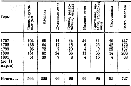 Легко заметить, что три самые острые, политически опасные категории (политический сыск, измена, оскорбление величества) составляют без малого половину всех дел - 258. Нетрудно понять, как строго исследовались такие дела и какое значение придавал царь малейшему проступку против своей особы. Унтер-офицера Мишкова, подозреваемого в авторстве злой карикатуры на царя (появившейся в Харькове), Павел приказывает в начале 1801 г., "не производя над ним никакого следствия, наказав кнутом и вырвав ноздри, сослать в Нерчинск на каторгу". Экзекуция была, по-видимому, умышленно затянута, и новый царь Александр I велел "оставить без исполнения". Приведем еще несколько типичных "сюжетов": "об арестовании погарских купцов... по доносу в дерзких между собою толках о строгостях императора Павла, кротости великого князя Александра и суровости великого князя Константина" (ЦГАДА, р. VII, № 3013, 1797 г.); "о шихтмейстере Никите Шангине, лишенном всех чинов и достоинств и отданном в Нерчинских заводах в работу за произнесение слов "Важное дело ваш государь!"" (там же, № 3315, 1799 г.); "о крестьянине Онуфрии Карпове, называвшем императора Павла царишком" (там же, № 3409, 1800 г.); "о наказании кнутом и ссылкой в Сибирь священника Степана Иванова, сказавшего на литургии после высочайшего титула "сей род да будет проклят", членов духовного правления Василия Григорьева и Никифора Матвеева, промедливших дать ход доносу о том, и о награждении архиепископа Вениамина" (там же, № 3574, 1800 г.). В заметной группе дел "о нелепых прошениях, толках, ложных доносах" находим следствие "О подпоручике Иване Биретове, желавшем быть при государи для говорения всегда правды" (ЦГАДА, р. VII, № 3262, 1798 г.); "О толках между раскольниками, будто император Павел есть значащийся в их книгах царь Развей" (там же, № 3519, 1800 г.). Больше всего подобных дел в начале царствования; в 1799-1800 гг.значительно меньше. Павловский режим, с одной стороны, поощрял доносы, с другой - пугал и доносчиков возможным поворотом дела не в их пользу. Прямые антикрепостнические выступления крестьян хотя и подавлялись обычно без участия Тайной экспедиции, но все же заняли свое место в ее делах. К тому же здесь по одному делу часто проходит много обвиняемых. Наиболее частый сюжет, встречающийся среди этой группы документов, - надежды крестьян на освобождение. Таковы дела о крестьянах Иване и Николае Чисовских, подавших прошение его величеству об освобождении их из крепостного состояния; "О солдате Иване Молотцове, сочинившем возмутительное письмо солдату Григорию Петрову и родным сего последнего о предоставленных будто бы крестьянам льготах". В 1798 г. статский советник Николев командируется в Ярославскую губернию "для разведания о намерении крестьян произвести смятение" (там же, № 3064, 3010, 1797 г.; № 3134, 1798 г.). Таким образом, по делам главного сыскного ведомства империи (так же как по военно-судным) заметно обилие самых суровых наказаний, а также сильное политическое наступление государства на дворянское сословие. Третьим возможным источником для статистического изучения этих процессов являются документы об амнистии, реабилитации, составленные в начале царствования Александра I. Н. К. Шильдер, ссылаясь на бумаги государственного секретаря Трощинского, сообщал о том, что па II марта 1801 г. "арестантов, сосланных в крепости и монастыри, в Сибирь, по разным гор