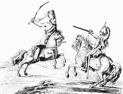 Это написано два года спустя, но впечатления еще живы, и никто не забыл, какой плач поднялся в Лицее, когда узнали... Горевали те, кто пришел в Лицей из Москвы, и те, кто никогда в Москве не был. Василий Федорович Малиновский меж тем получает секретную инструкцию об эвакуации Лицея, если неприятель двинется к Петербургу... Битва казака с французом,