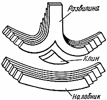 Рис. 49. Якорь Ричарда Перинга Рис. 50. Развилина, клин и налобник якоря Перинга В угол, образуемый ветвями развилины, вваривался клин, который сверху закрывался налобником. Развилина, соединенная под ударами молота с клином и налобником, - ворот якоря. К концам развилины приваривали рога и веретено. Это давало плавный скругленный переход от веретена к рогу, что устраняло в вороте концентрацию напряжений. Перинг изменил и пропорцию якоря: веретено и рога стали короче и толще, а сечение веретена от шеймы до ворота стало почти эллиптическим.
