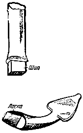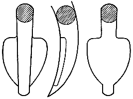 Наконец, для увеличения прочности соединения веретена с рогами Перинг придумал развилину (рис. 50), коренная часть которой по сечению равнялась сечению нижней части веретена, а сечения ветвей, загнутых под нужным углом, совпадали с сечением нижней части рогов.