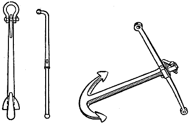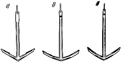 "Сего июня 11-го, корабль "Лесное" валили на правый бок до самого киля, и на левом боку никакого повреждения не обрели; и потом повалили на левый бок также до киля, и нашли проломленную скважню у самого киля. Первая доска проломлена якорем насквозь и знатно, что на свой якорь наткнулись, и в том месте, где Ваше Величество изволили якорь застать в воде под кораблем, на правой стороне, под самым фок-мачт-шпором, а проломлено на 14 дюймов вдоль корабля и поперечь досок на десять дюймов; и оный приведен в первое состояние, как на воду спущен" [21].В те времена, когда о двойном днище и о водонепроницаемых переборках никто и не слыхал, такая угроза вызывала у моряков вполне понятный страх.Шток адмиралтейского якоря, деревянный или железный, расположенный перпендикулярно плоскости рогов, сильно усложнял уборку самого якоря на судно.