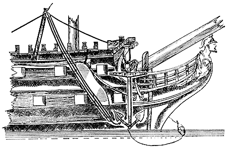 Как уже рассказывалось, якоря поднимали с грунта за канат с помощью шпилей и кабаляров. Шпиль вращали до тех пор, пока шток якоря не оказывался над водой. После этого шпиль брали на пал, т. е. останавливали и стопорили. Естественно, что якорь со штоком нельзя было втянуть шпилем в клюз, поэтому окончательный подъем якоря на борт осуществляли с помощью талей, укрепленных на крамболе. Показавшийся из воды якорь зацепляли за рым кат-гаком и талями подтягивали под крамболом (рис. 59). Эта процедура называлась "взять якорь на кат". После этого в якорный рым продевали толстый конец, который назывался пертулинем, и крепили его за два деревянных кнехта у крамбола на палубе. Теперь висевший на пертулине якорь необходимо было подвесить у борта, горизонтально. Для этого использовали еще один деревянный брус, шарнирно закрепленный на фока-русленях, - так называемую пентер-балку. Эта балка была снабжена пентершкентелем или фиш-талями с пентер-гаком, который закладывали за ближайший к борту рог якоря (рис. 60).